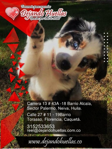 Funeraria para mascotas “Gracias por todo lo vivido” Carrera 13 # 43A -18 Barrio Alcala, Sector Palermo, Neiva, Huila. Calle 27 # 11 - 19Barrio Torasso, Florencia, Caquetá. 3152533653 reel@dejandohuellas.com.co www.dejandohuellas.co